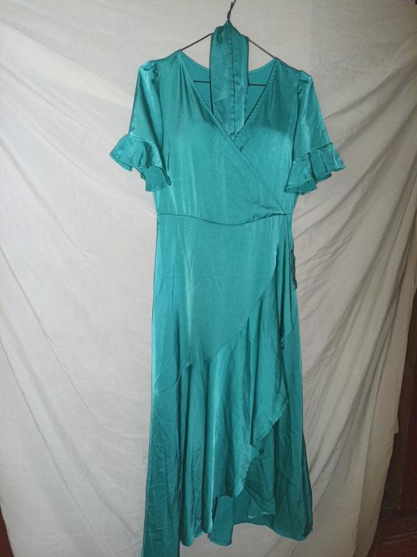 платье очень красивое, переливается, цвет морской волны,есть один нюанс показала на последних двух фото. застёгивается на декоративную змейку, есть пояс. длина-126, с переди короче и оно распахивается,плечи - 39,40 .пог- 48,50. грудь на запах. пот-38. на размер 38-40 идеально сядет