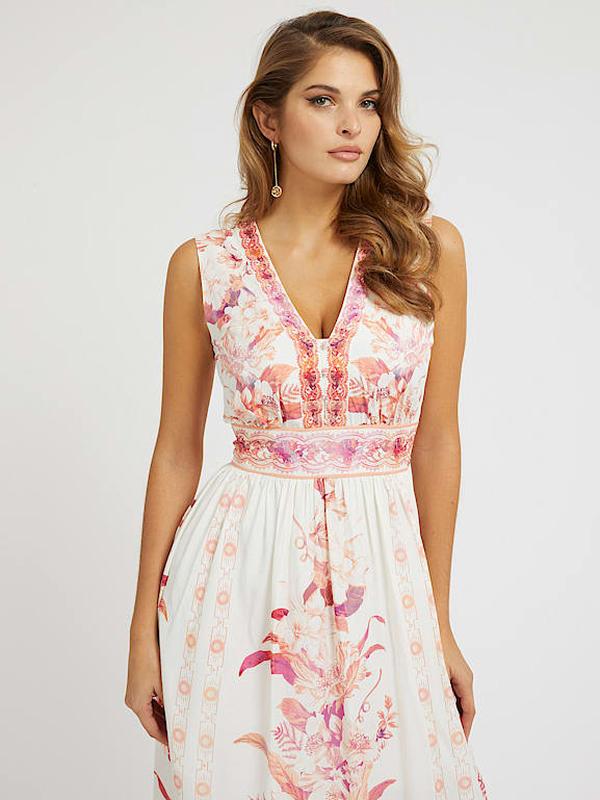 Нова сукня з біркой від Guess Номер коду W3GK30WFCX0 Довга сукня із віскози. V-подібний виріз. Без рукавів. Застібка-блискавка. ОСОБЛИВОСТІ ТКАНИНИ: Квітковий принт по всій поверхні. Розмір ХS. Чудово сідає і на S. Загальна довжина: 144см ПОГ 44см ПОТ 35см СКЛАД ОСНОВНОЇ ТКАНИНИ: 53% віскоза та 47% поліамід. ПІДКЛАДКА: 100% віскоза. ДОГЛЯД: Прання при максимальній температурі 30°C.
