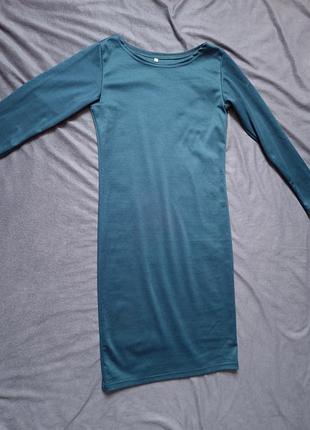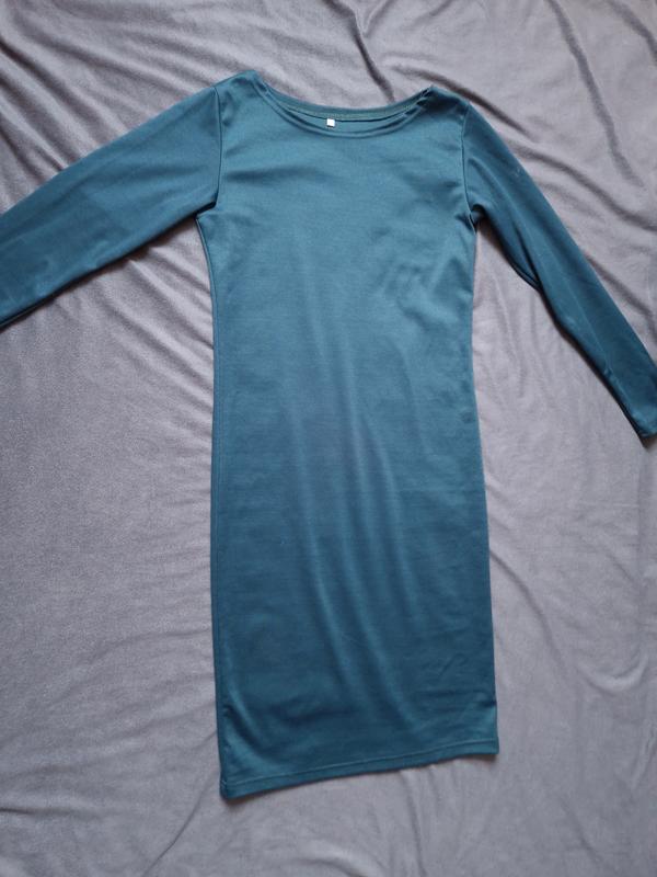 Приталена базова сукня довжини до коліна, розмір 44. Приємна до тіла тканина, еластична, не просвічується. Має простий крій із довгим рукавом і округлим вирізом. Гарно облягає фігуру, підходить як для щоденного образу, так і для роботи або зустрічей. Колір — глибокий темно-бірюзовий.
