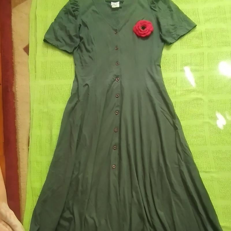 платье женское,импортное,тонкое трикотаж х/б, очень приятное к телу,цвет зелено-бутилочный, украшена брошью ручной работы, которую можно открепить при необходимости на другую вещь.