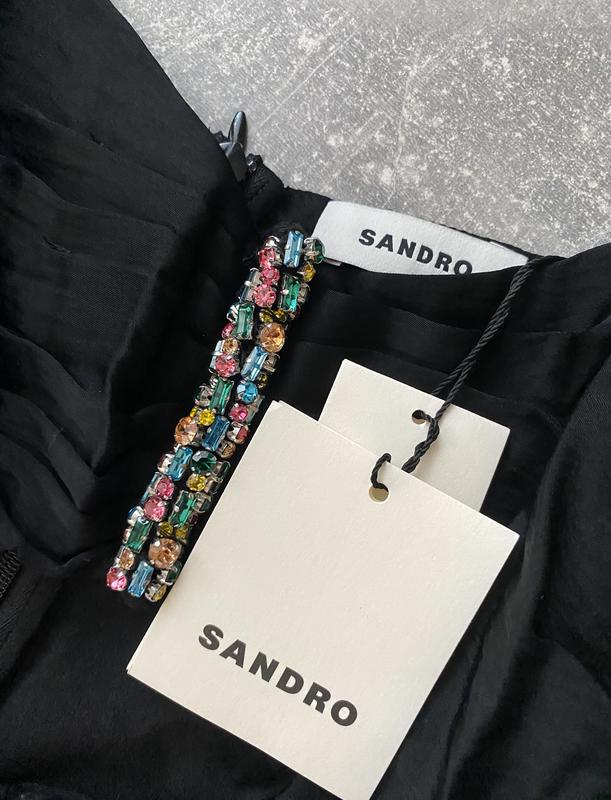 А В цій неймовірній приголомшливій сукні 🔥🖤🔥 вам неодмінно мають відчинятися всі двері, стелитися всі доріжки та лунати з усіх сторін компліменти , у супроводі захопливих поглядів 😍 Ну божественна просто , без зайвих слів ! Сам фасон, з цікавим оригінальним декольте, якість тканини, цей декор у вигляді різнобарвних кристалів що мерехтливо сяють на чорному фоні!🤩, неодмінно притягуватиме увагу . Нова, від Sandro Приємна тканина, за складом- штучний шовк, ацетат. Тримає форму Пишні рукава ліхтарики гарноі довжини Розмір 36, хс/С Довжина 132 ПоГ 44/45 ПоТ 34
