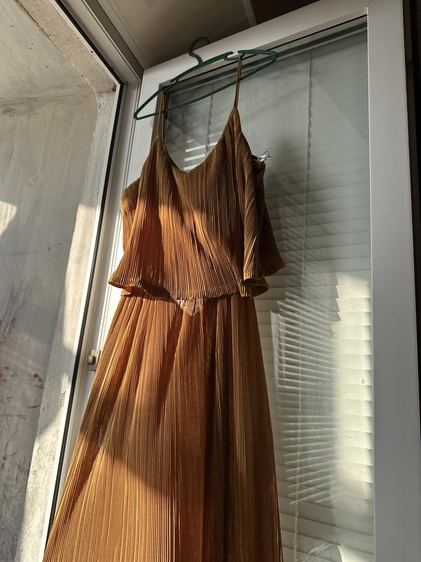 Нове плаття від h&m з поліестру, жовто-помаранчевого кольору. Тканина як жатка, не мнеться, добре тягнеться. Може підійде і на М, і на xs. Завдяки резинці можна регулювати довжину
