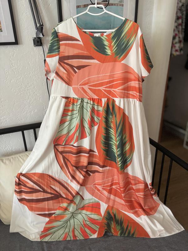 Приємний до тіла поліестр, є кишені. Є нюанс: зачіпочка, на фото. Плечі - 46 Між пахвами - 62 Рукав довжина - 19 Рукав ширина - 20 Ширина талії - 60 Загальна довжина - 131