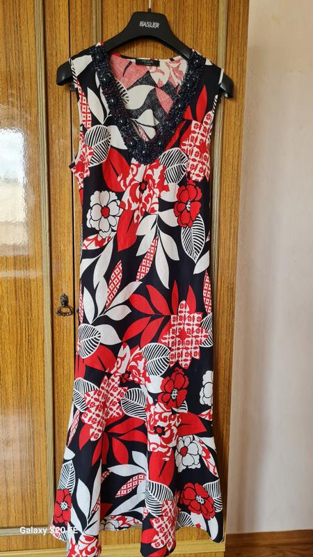 Из качественного настоящего плотного льна новое платье, красивое платье с острой горловиной, накруг которой красивые в тон синие караленки, со стороны длинная молния дов.122см ног 58см нот 54см ноб 61см
