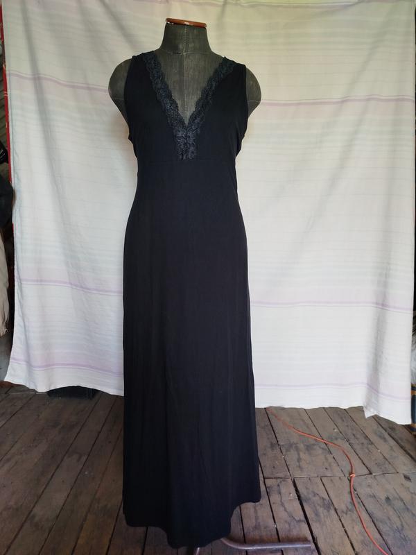 Длинное трикотажное платье черного цвета, V-образный вырез украшен кружевом. Длина изделия на манекене 135 см, талия 45 см, грудь 47 см.