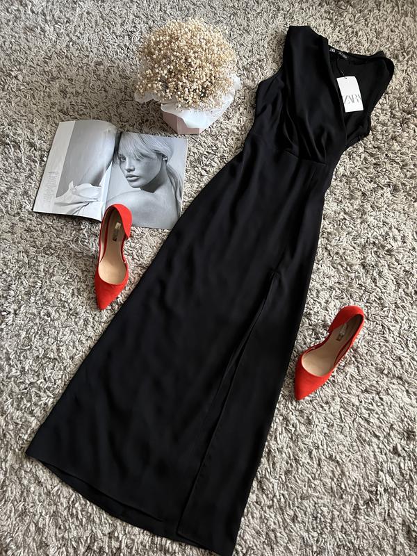 Сукня на XS, з розрізом та капюшоном, довжина 137 см, у грудях на запах н/о 41-44 см, н/о в грудях 31-33 см, збоку блискавка, в бедрах н/о 44-45 см