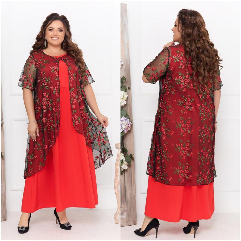 Сукня арт. nf. 3446 Ткань: софт + сетка вышивка Цвета: т.зеленый, красный, черный Размеры: 52-54, 56-58, 60-62 Длинное платье с накидкой в вечернем стиле. Платье без рукавов, по линии талии отрезное, выполненное из софта (растяжимости нет). Вырез горловины круглый, юбка широкая. Накидка придает образу легкость, и маскирует любые особенности фигуры. Выполнена из сетки с нежной красивой вышивкой, длина рукава до локтя. Застежек, карманов нет. Платье идеально подойдет для торжественных событий.