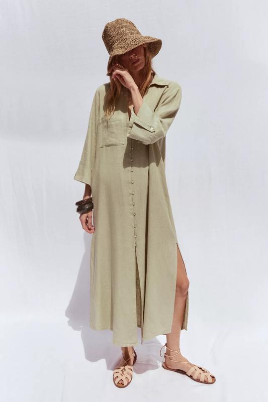Сукня-туніка зі змішаної лляної тканини з сорочковим коміром і рукавами нижче ліктя з хлястиком із ґудзиком. Накладні кишені спереду, бічні розрізи внизу. Застібається на ґудзики спереду. 55% ЛЬОН 45% ВІСКОЗА Розмір L