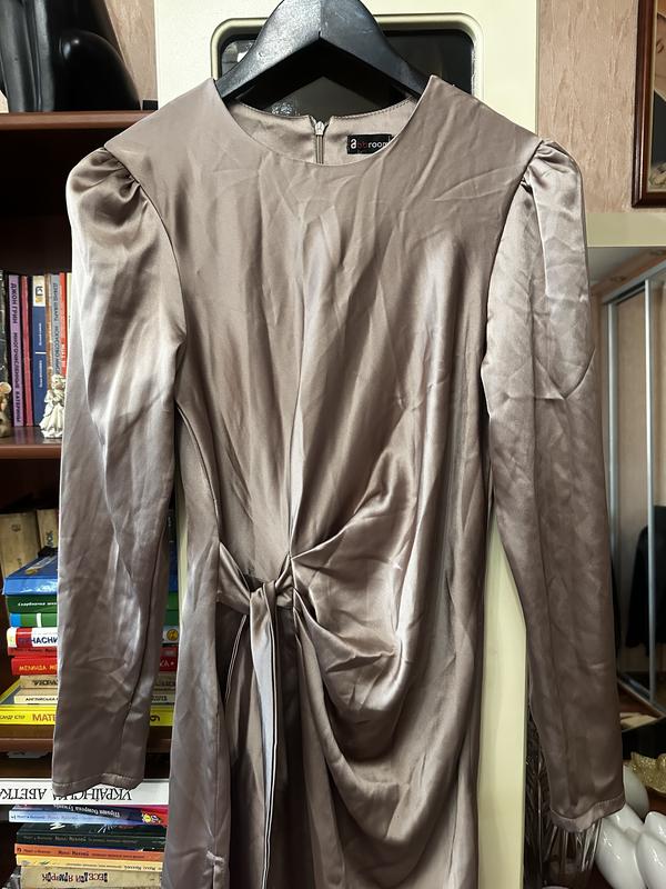 Дуже гарна сукня з асиметричним низом, та драпіруванням на животі, з рукавами Фанариками довгими, ззаду на замку, довжина рукава 61, об’єм грудей 43 об’єм талії 38 і об’єм Бедер 45, довжина виробу 115 Там де довгий край 135