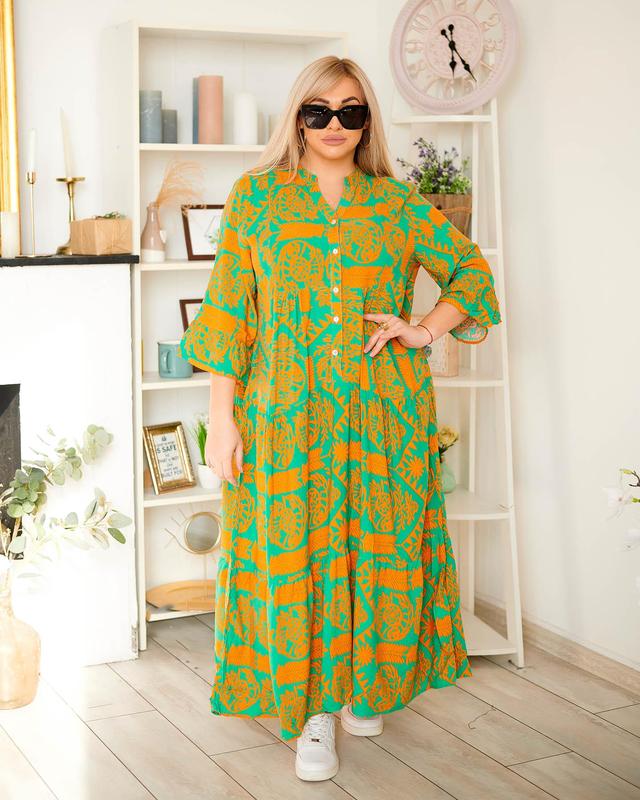 Сочное сочетание зеленого и оранжевого цвета Свободный фасон - подходит на любую фигуру 24 Легкая, воздушная ткань — комфорт в жаркую погоду гарантирован! Скрывает живот и бедра Рукав 3/4 - прикрывает руки добавляю шарма Размер 54-56 ог до 115 ос до 130 На меня оказалось слишком большое (