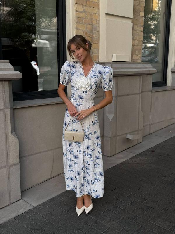 Платье миди "Flora" с романтичным цветочным принтом. Модель имеет объемные рукава, глубокий вырез и завязывается на пояс, подчеркивая талию. Декоративный объемный цветок пришита Размер: XS, S, M, L Тканина: льон Уход: ручная стирка до 30° Производство: Украина ____________________________ Длина по спинке 130 см Длина рукава 24 см