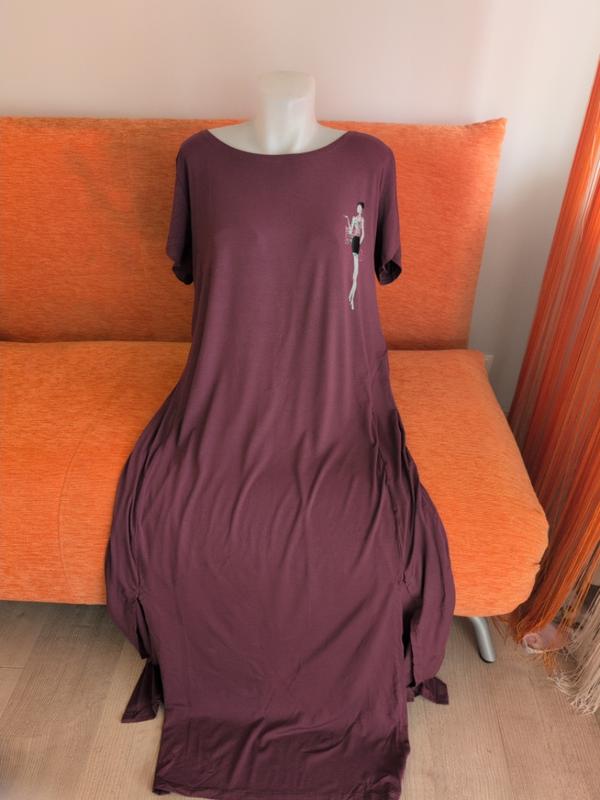 Стильное, длинное платье в насыщенном бордовом цвете. ✔️ Силуэт А - расклешенный от груди к низу, комфортный и в то же время женственный. ✔️ Длина изделия - 140 см, макси, смотрится эффектно по фигуре. ✔️ Два разреза по бокам добавляют легкости и свободы движений. ✔️ Материал: 98% вискоза, 2% эластан – мягкий, эластичный, хорошо держит форму. ✔️ Круглый вырез горловины, короткий рукав. ✔️ Декор: оригинальный принт с силуэтом девушки, отделанный стразами. ✔️ Совершенно новая, со всеми бирками. 📏 Размер: 66 (обхват груди ≈ 132–134 см, ткань эластичная). 💡 Идеальный выбор для тех, кто любит свободный, но элегантный крой. Подходит и для вечернего выхода, и для повседневного образа с акцентом на комфорт.