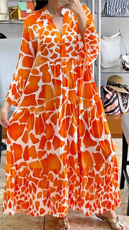 Классное, стильное, качественное, красивое платье,крой свободное, ярусами,рукав три-четвертые,до бедрах застегивается на пуговицы, ткань качественная вискоза, окраска абстракция,пог-55,пот-56,по бедрах свободно, длина -130/134, длина рукава -48.