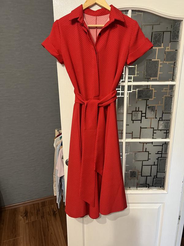 Дуже стильна красива сукня в мілкий білий горошок.Тканина прекрасно тримає форму, заміри надам