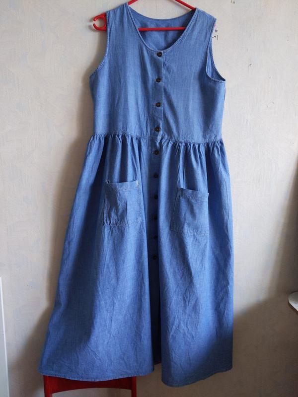 Джинсовое платье сарафан с накладными карманами на пуговицах. Джинса облегченная, летняя. ПОГ 51 ПОТ 51 По низу 143 х 2 Длина 130 Дл. верха 42 Длж низа 88 Пройма 25/26 На одном из карманов по обе стороны дефекты – см. последнее фото. Зашивается,тинюй.*.