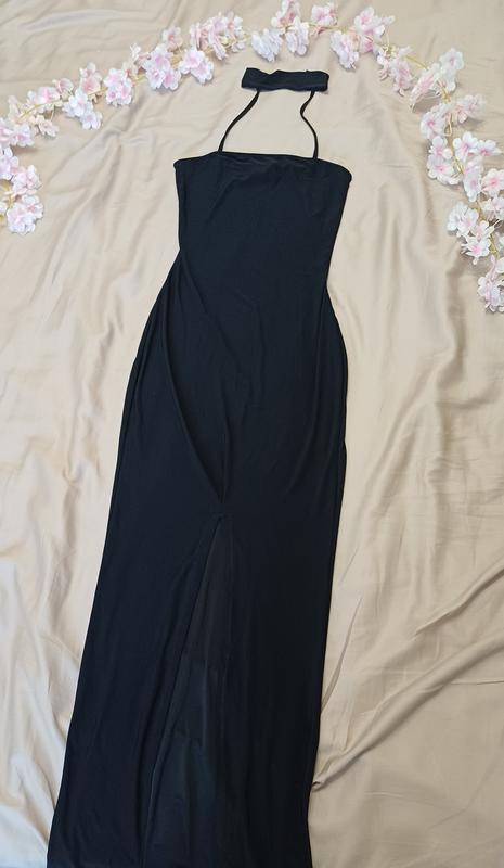 Платье с чокером размера S, есть разрез снизу посередине для ножек. Ткань легкая, мягкая, очень эластичная. Состояние 5/5, единственное, что шов на разрезе не самый качественный (последнее фото) Замеры в нерастянутом состоянии: Полуобхват груди - 34 см Полуобхват талии - 30 см Длина - 133 см
