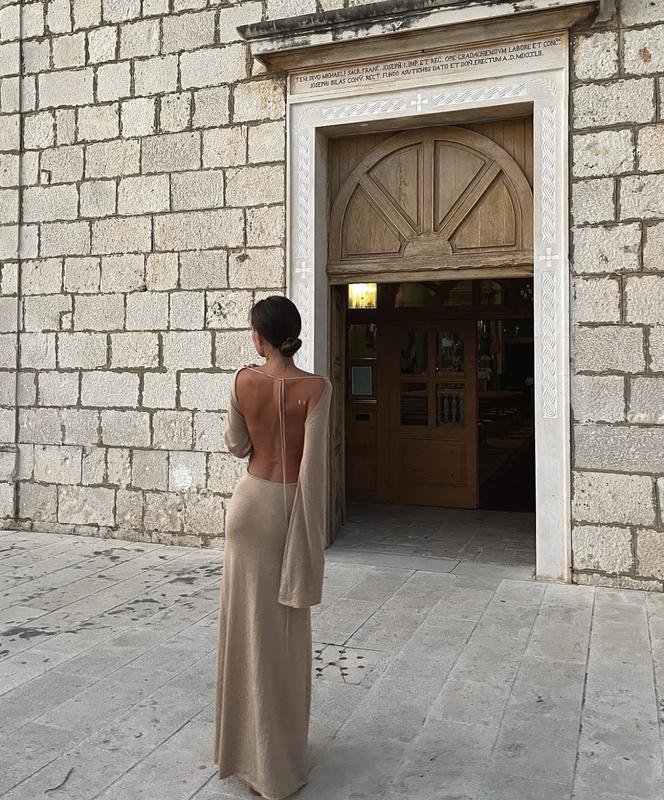 розкішна довга сукня з відкритою спиною від українського бренду бежевий колір, вказано розмір s, але на м підійде також