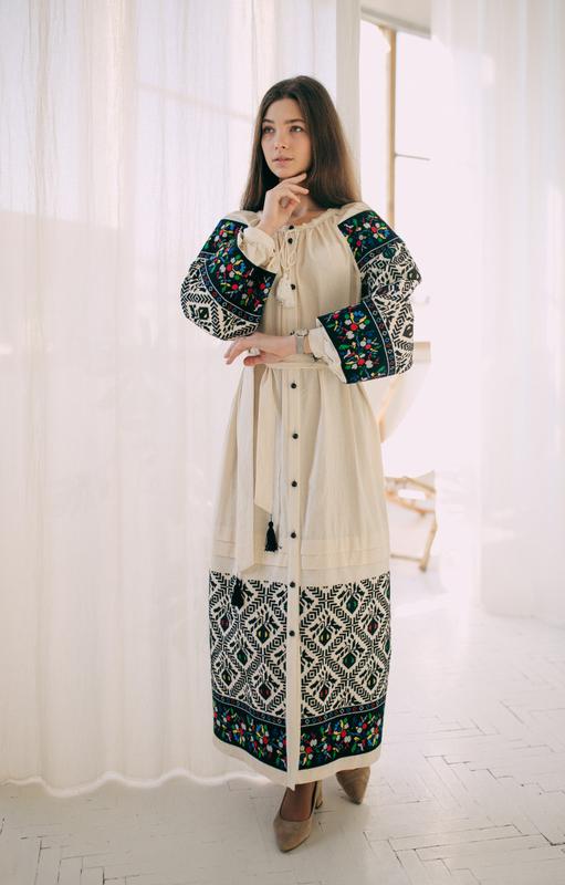 Жіноча вишита сукня Piccolo Нова борщівка Неповторно пишна жіноча вишита сукня. Борщівська вишиванка займає особливе місце в нашій історії. Густий борщівський візерунок вишитий хрестиком. Натуральна бавовна створює комфорт за будь яких погодніх умов. Тканина бавовна бежевого кольору з вкрапленнями - частинками необробленої бавовни. Застібка - гудзики на манжеті та по довжині сукні. Пояс підкреслить твою чудову талію.