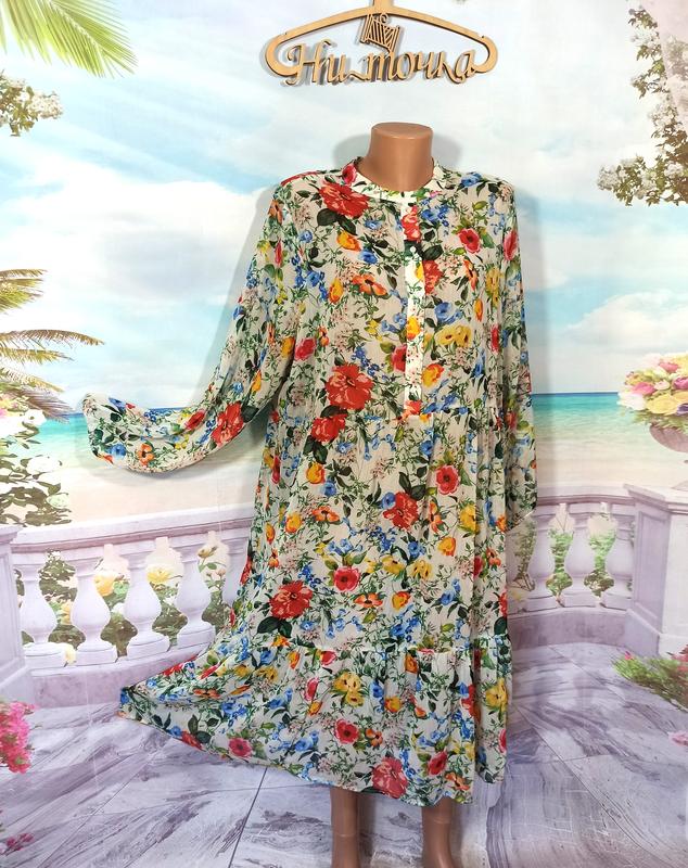 Предлагаю легкое платье из шифона Летние цветы, невесомое облачко, бохо стиль! Фирма PRIMARK пр-во Турция Размер указан 46/48 евро, пойдет на 54-56 - наш Платье свободного силуэта, без подкладки, застежка спереди на пуговицы, на кокетке до талии, пышная юбка от кокетки, оборка по низу, рукав полной длины с резинкой по низу, Цвет -молочный, цветочный принт Длина - 111, полуобхват груди - 61см,полуобхват талии-57, длина рукава-58см Ткань - тонкая, легкая , полупрозрачная. шифон, полиэстер-100%, Состояние - отличное