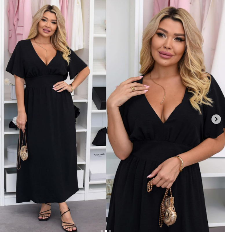 пр2\ платье Тканина: Американский креп жатка Цвета: черный, ВЫМЕРЫ: На талии сзади резинка 52-54\ и на 56 подойдет Ог 122 см, вот 106-128 см, об 170 см, длина рукава 25 см, обхват руки 45 см, длина по спинке 125 см.