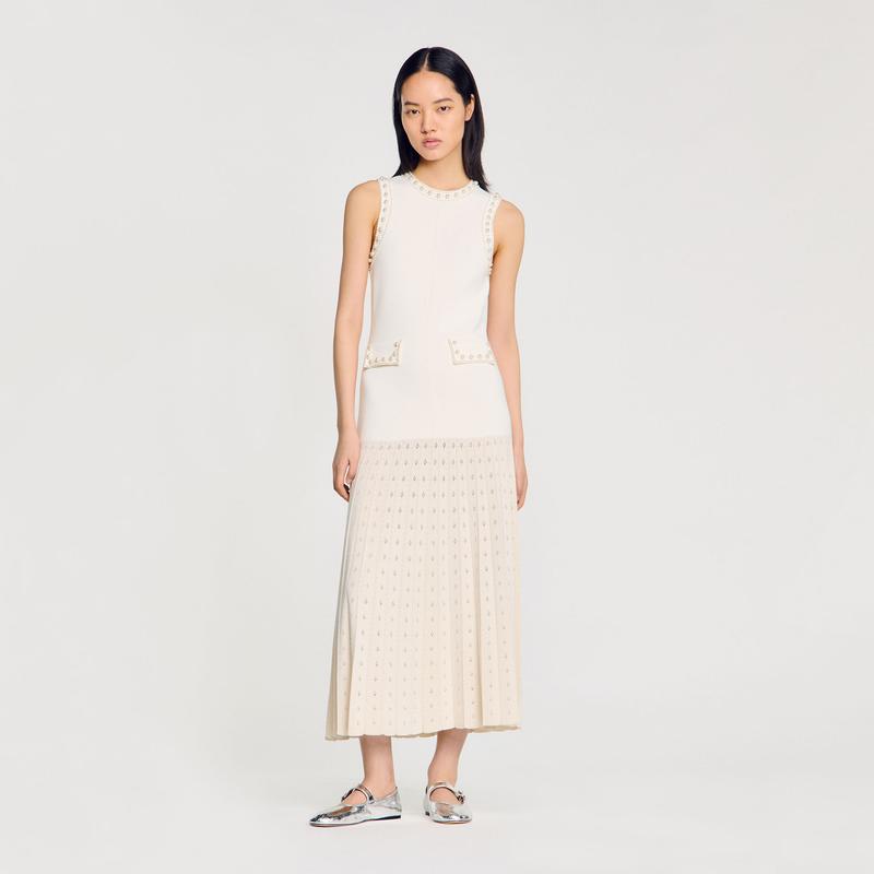 Перед оформлением заказа, пожалуйста, пишите в чат свой размер 😍❤️👌🌹 ✅ Оригинальный с ценником. Трикотажное макси бежевое платье Sandro макси с декоративными карманами, круглым вырезом, без рукавов, с карманами с перламутровым бисером и плиссированной юбкой pointelle. Цена на сайте производителя: 195976 Ref: SFPRO04083 SIZE: S / M / L Main fabric: 53% viscose, 45% polyamide, 2% elastane ✔️Возвращение возможно.