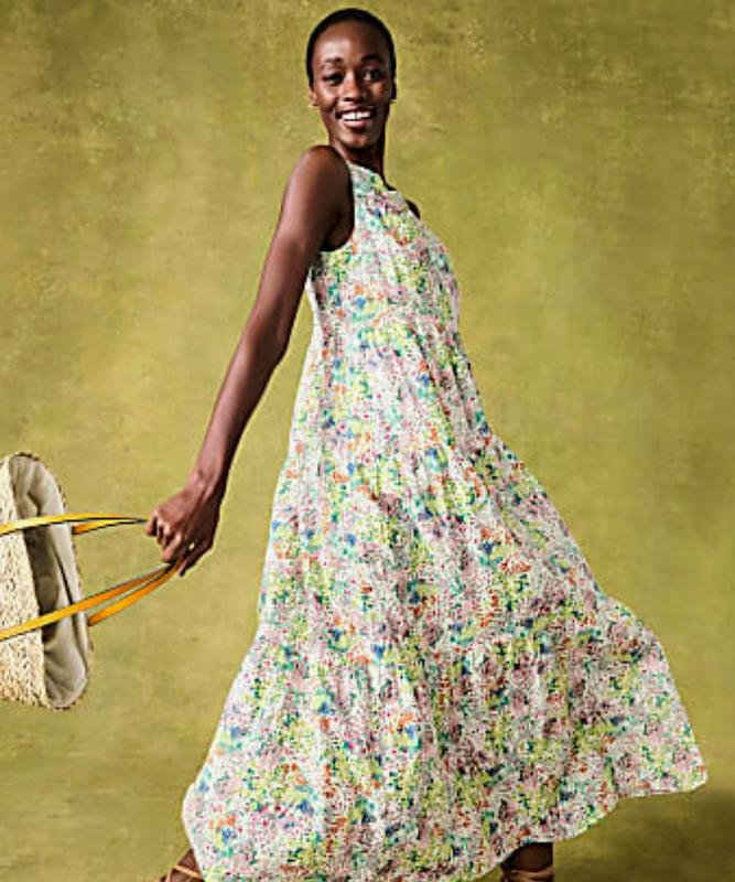 Классное, стильное, качественное,длинное платье,крой свободный, ярусами, расцветка в мелкие полевые цветы, вырез под шею, сзади застегивается на одну пуговицу ткань тоненький хлопок, пог-49,пот-59,по бедрах свободное, длина -132.