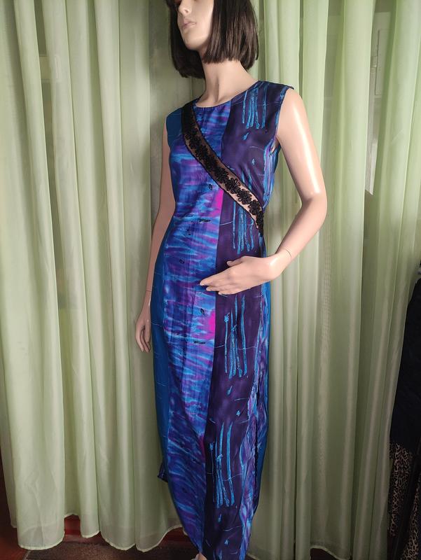 Платье длинное бренда "Maks" ( New York), полиэстер, XL, украшено кружевом, по низу в боковых швах высокие разрезы, талия на завязках, цвета аквамарин с градиентом. Длина изделия 127 см, полукруг груди 52 см, полукруг бедер 54 см, талия свободно (прямой силуэт с завязками по талии), высота разрезов 50 см.