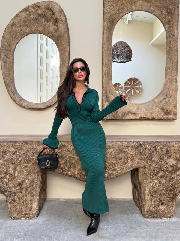 Женское вязаное трикотажное длинное платье поло с воротничком и длинным рукавом изумрудное