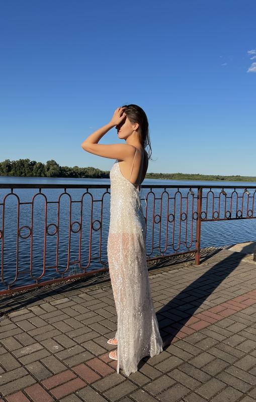 Яркое белое макси платье с пайетками от Gepur, размер S. Одевается всего на один вечер. Купила одной из первых в физическом магазине не колеблясь, потому что знала, что совсем скоро ее не будет в наличии. Так и случилось, потому что платье сидит идеально. Красиво подчеркивает спину, Едва прикрывает ноги, но за счет правильного разреза - делает ноги визуально длиннее. Классно будет смотреться на девушках с маленьким и большим бюстом. Есть два варианта, чтобы занести платье. Цвет пайеток легкий нежно белый, не яркое серебро. Платье не вульгарное, но подойдет для смелых девушек. Я под это платье одевала кружевную юбку этого же бренда, которая стоила около 1100. Могут тоже добавить к платью за отдельную плату. Цена платья на сайте была: 4600 грн Моя цена: 3499