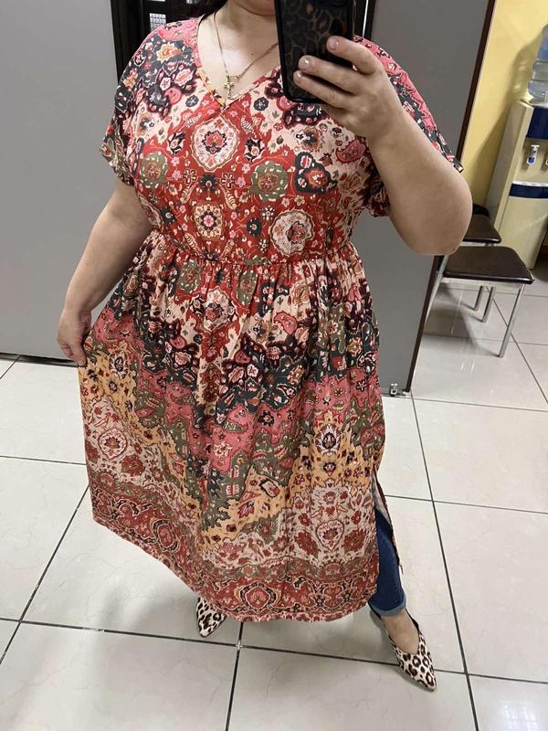 Длинное платье Невесомое Длина 129 Грудь полуобьем 60 можно и больше за счет резинки на поясе Бедра полуобьем 90 По бокам есть разрезы Интересная расцветка Ткань полиэстер но платье невесомое