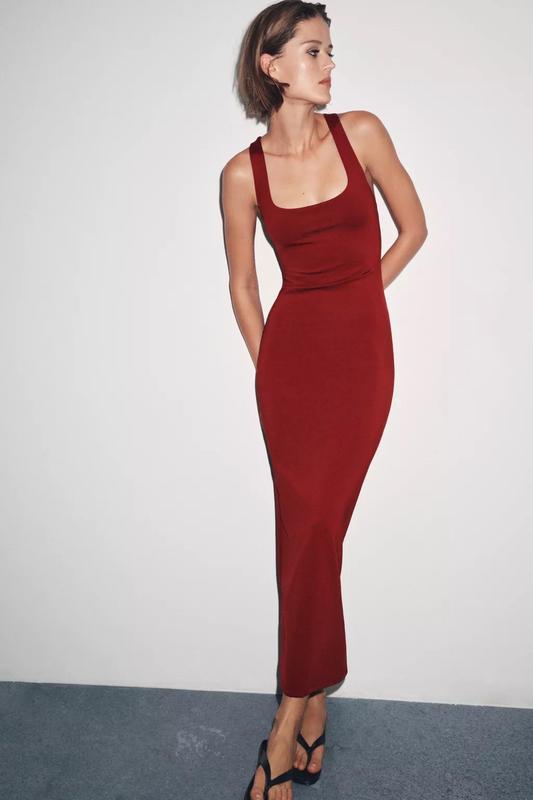 Довга сукня з пряжі із суміші поліаміду. Квадратний виріз і широкі бретелі, що перехрещуються на спині. БОРДОВИЙ | 3641/704/681