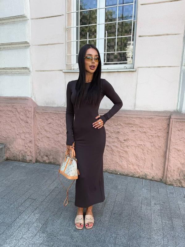 Женское длинное облегающее платье макси с длинным рукавом вискоза коричневое шоколадное
