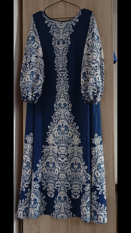 Платье роскошное, невероятно красивое Ткань гладкая, средней плотности 100% полиэстер Поясок потерян, но можно использовать любой другой ремешок Рукав красивый широкий, при конце на резиночке Размер указанный XL евро 44, на меньший размер также отлично подойдет, будет свободнее Поврокупругость груди 54 см, не тянется Длина платья по спине 128 Рукав от плеча 58 Плечи 41 см Поясневчивость талии 59 см, можно подчеркнуть поясочком Пивокружность бедер 75 см, должна быть свободно