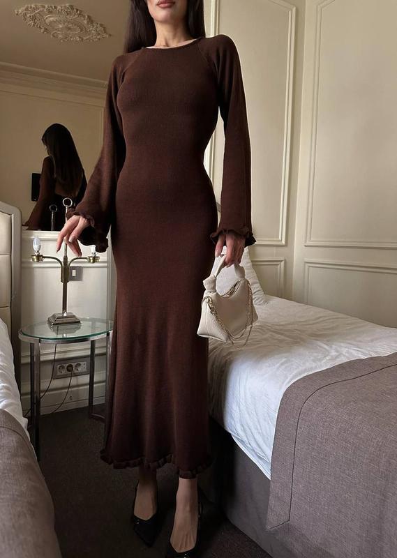 Женское вязаное длинное платье с открытой спиной шоколадное коричневое