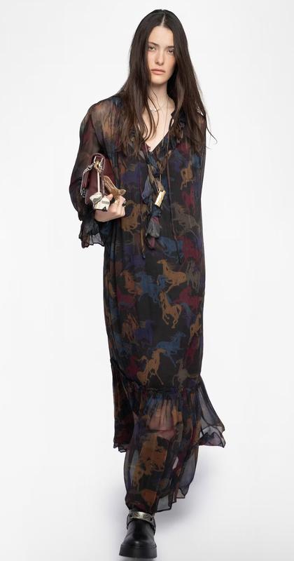 Длинное шифоновое платье - Принт с изображением лошади - Глубокий вырез с оборками и кулиской - Длинные струящиеся рукава с оборками - Прозрачный струящийся крой с нижним платьем