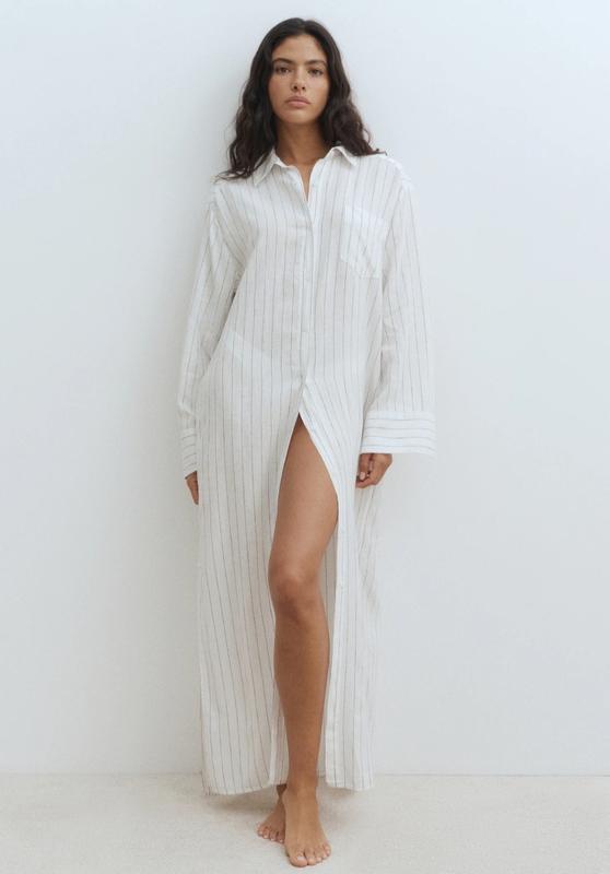 Новое льняное длинное платье -рубашка с карманами h&m белое в полоску