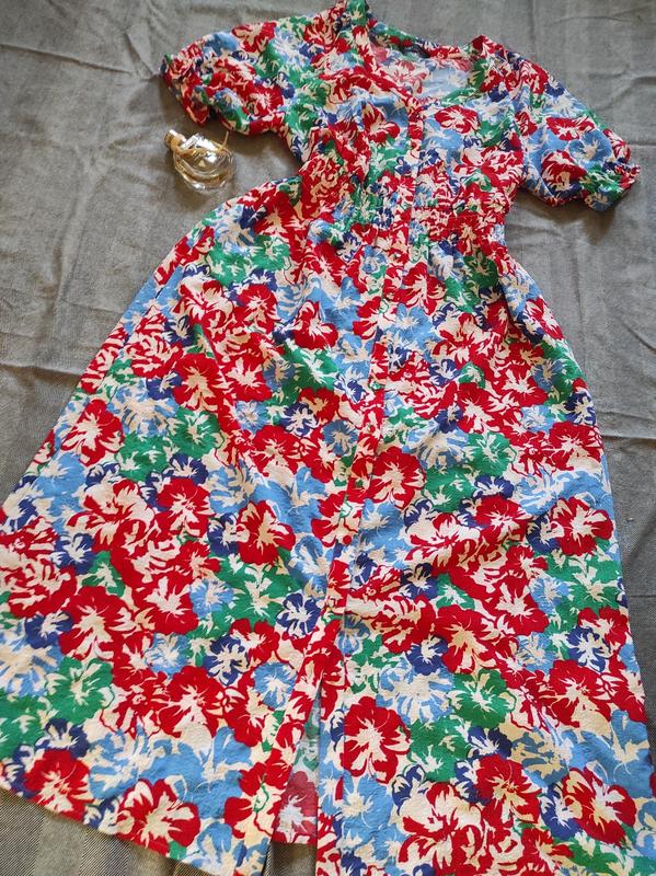 Удивительное платье миди в цветы 🌸 Ткань легкая, жатка, очень приятная к телу. Красивое сочетание цветов. Рукава и талия на резинках. Впереди полностью на пуговицах. Красиво и эффектно смотрится на теле. Указан размер 14 Состояние новой Талия от 39см, легко тянется до 54 и более Рукав 37/38 от плеча Длина 121 по спине