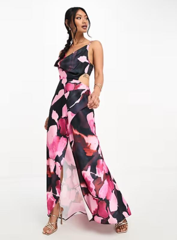 Атласное платье мидакси с капюшоном ASOS DESIGN, вырезанной талией и градуированным подолом в черный цветочный принт.🌸