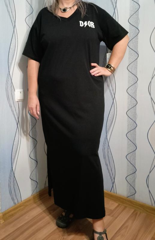 Классное, стильное, качественное, длинное платье -футболка, рукав свободный до локтя, линия плеча слегка спущена, V подобный вырез, по бокам разрезы, цвет черный насыщенный, ткань 100% хлопок, новая с биркой, пог-62, пот-60, поб-62, длина -134, длина рукава от шеи -39.