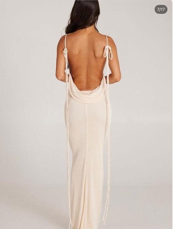бежева сукня з відкритою спинкою розмір S напівобхват: груди-35см(потягнеться до 45см) талія-вільно(40см) стегна-42см(потягнеться до 51см) довжина сукні-140см