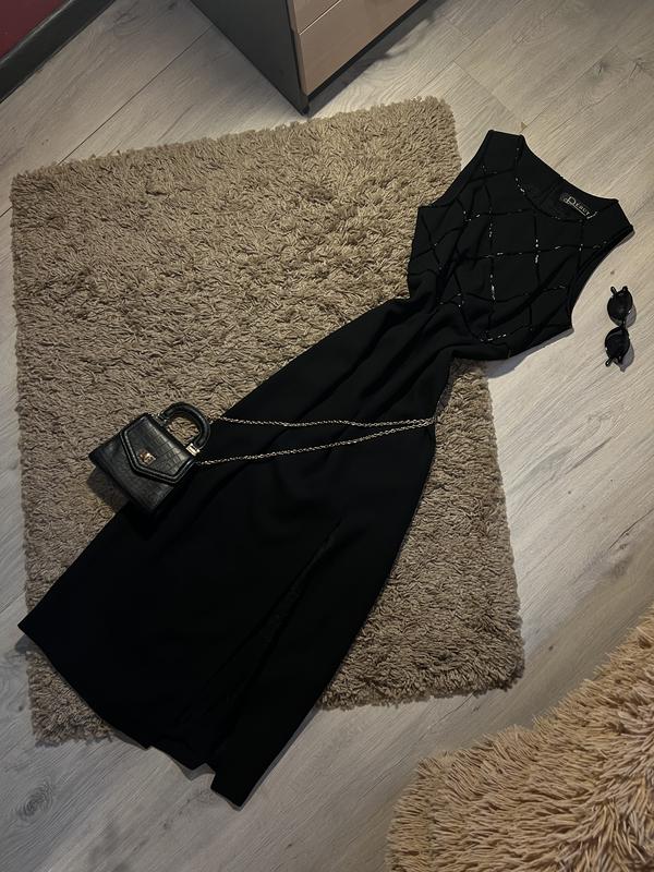 Довга чорна сукня по фігурі без рукавів з вишивкою бісером на грудях❤️ XS/S/M Плечі - 31 см Груди - 44 см Талія - 39 см Стегна - 49 см Розріз - 51 см Змійка - 53 см Вся довжина - 130 см Сукня виглядає дорого. Матеріал дуже якісний і приємний до тіла. Річ, яка має бути у кожному гардеробі. Стан: нової❤️