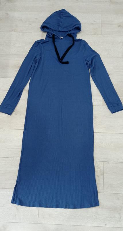 платье в рубчик длинная с капюшоном синего цвета. состояние отлично. замеры: в плечах 40, рукав от плеча 63, длина вся 124. внизу по бокам небольшие разрезы.Брала себе, не подошло по размеру.95%вискоза, 5%эластан.