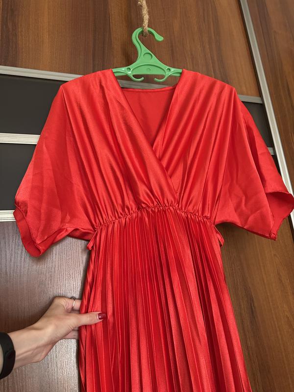 Сукня максі зі спідницею плісе, яскраво червоного кольору, під атлас Розмір: XS, S (36/44) Стан 7/10, є невелика пляма попереду фото 3 (виводити не намагались, можливо й забереться)