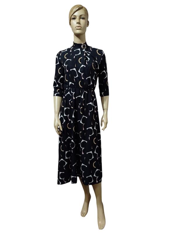 Лёгкое симпатичное платье в очень хорошем состоянии. Длина изделия по спинке от плеча 128 см, полуобхват груди 48-50 см, полуобхват талии регулируется резинкой и тянется от 31 см до 54 см, полуобхват бедер 72 см, длина рукава 39 см. Ткань немного тянется. Модель 7048Д