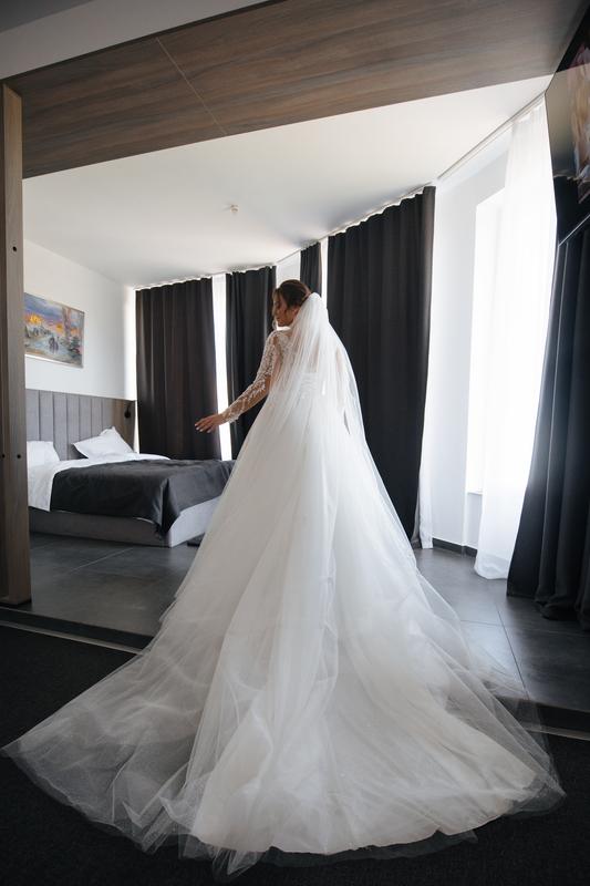 Глибоке, але витончене декольте 🌿 Довгі рукави з мережива 💎 Легка фатінова спідниця з делікатним блиском(дрібним) 👑 Є підстібка для шлейфа з дрібних крючків (зручно танцювати й рухатись) 💍 Сукня виглядає розкішно як на фото, так і вживу! 📏 Розмір: (M-L) завʼязка шнурівка( сукня на ріст 160-180); зможу скинути додатково заміри та чашку 🎨 Колір: айворі 🌸 Стан: як нова / одягнена 1 раз;після хімчистки 🧳 У комплекті: чохол Є торг!!!