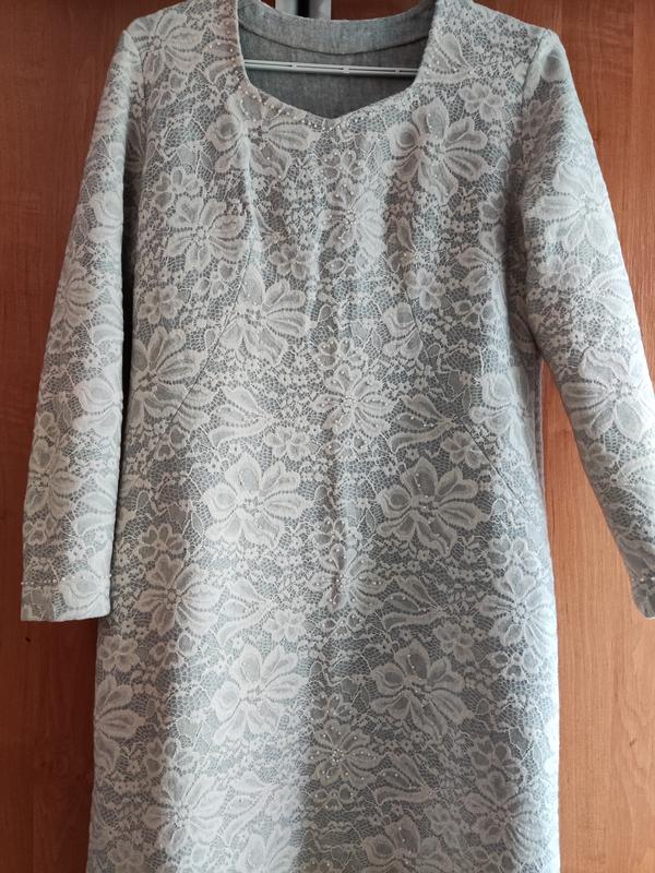 Тепле довге плаття сірого кольору з довгими рукавами та квадратним вирізом горловини. Воно має ажурний візерунок та вшите бісером, що нагадує мереживо з квітковими мотивами, нанесений поверх основної тканини. Розмір 50-52. Додаткові фото надам.