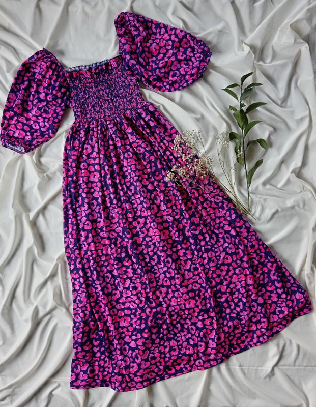 Яркое женское платье, в леопардовый розовый принт, с квадратным вырезом, присборенным лифо...