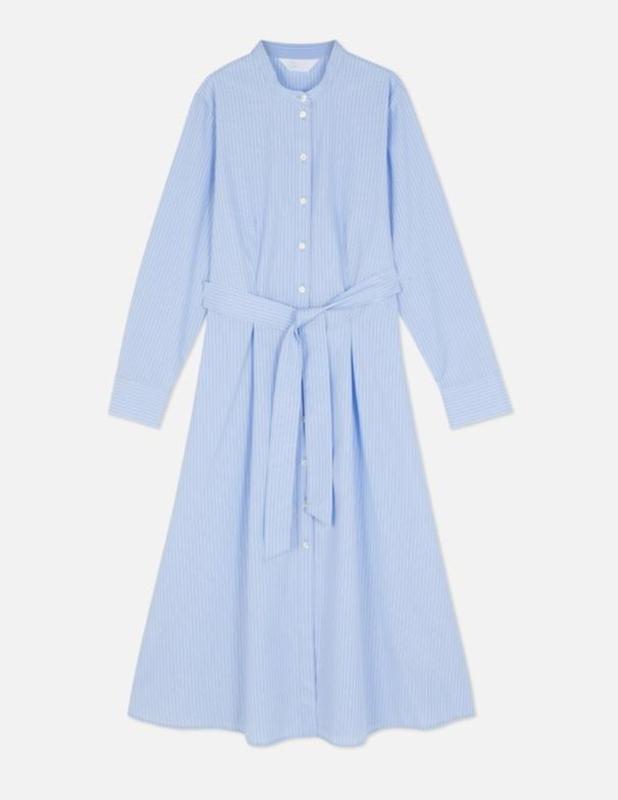 новая без бумажной Бирки Цвет: Голубой с белой полоской (классическая рубашечная ткань). Размер на бирке: UK 12 / EUR 40. Фасон: Платье-рубашка, длина миди, воротник-стойка (mandarin collar). Детали: Длинный рукав с манжетом, застежка на пуговицы по всей длине, пояс в комплекте подчеркивающий талию. Длина платья: 120 см Ширина по плечам (от шва до шва): 40 см Полуобхват груди (ПОГ): 50 см Длина рукава (от плечевого шва): 60 см