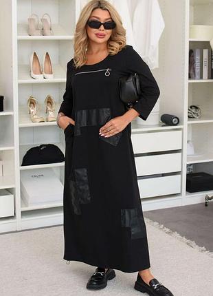 Сукня арт. lub. 1102 Розміри: 46-48, 50-52, 54-56, 58-60, 62-64 Тканина: двонитка Колір: чорний Довге плаття в підлогу, прикрашене шкіряними вставками + робоча молнія на грудях, які привертають увагу, як цікава родзинка. З боків по низу плаття дві робочі блискавки.