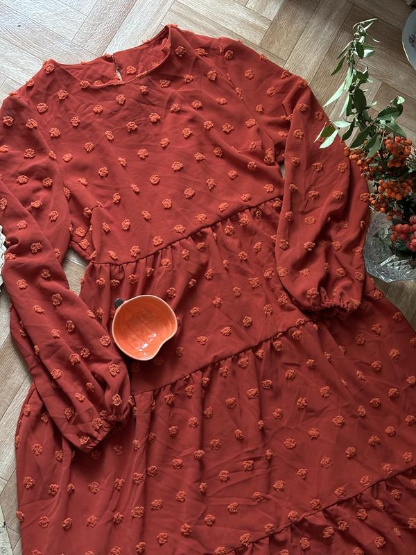 Чудова осіння сукня вільного крою. На резинці. Сідає вільно. Можна як оверсайз. Має гарний акцентний горошок. Чудова і для фотосесії і на кожен день. Чудово підійде для вагітних. Дефектів немає, нюансів також.